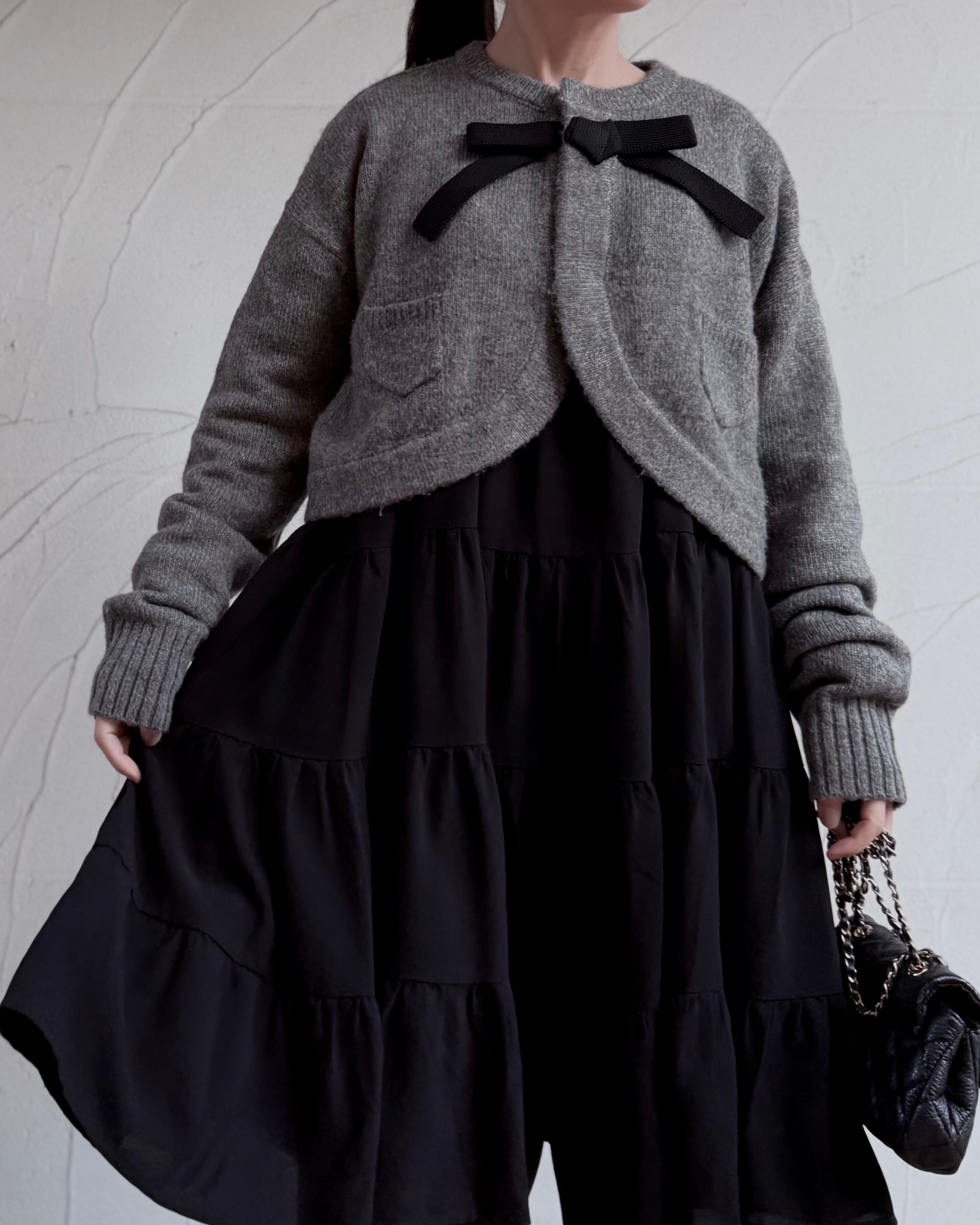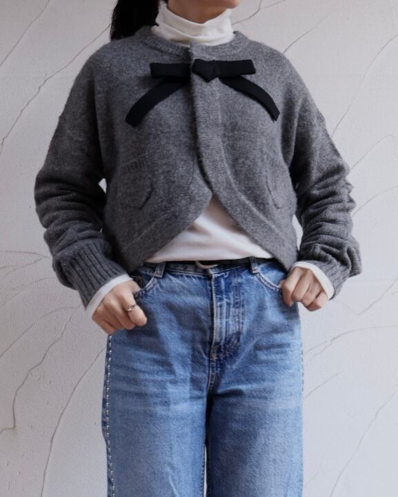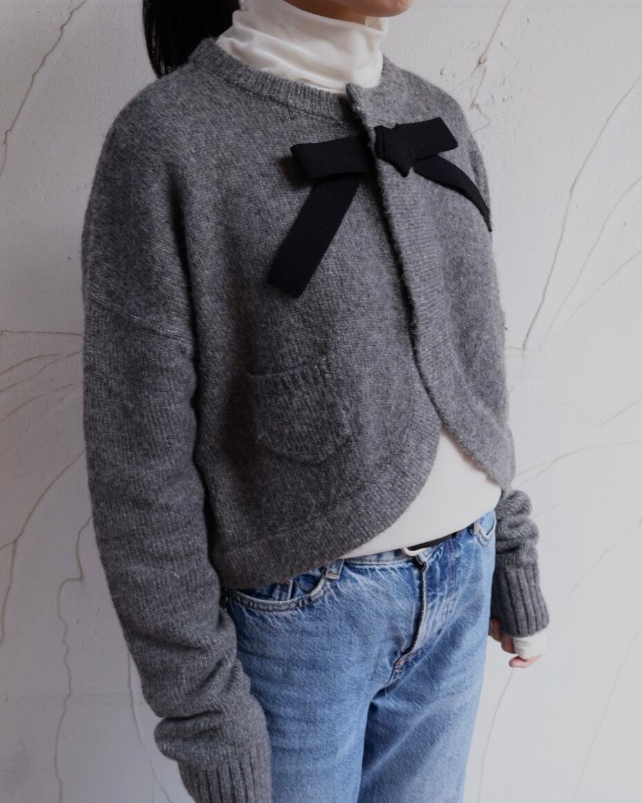 ふんわりと毛足のあるニットに首元のリボンがクラシカルな印象を添えるボレロ風カーディガン。