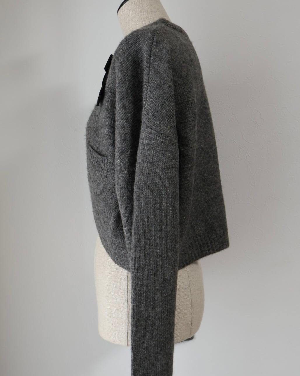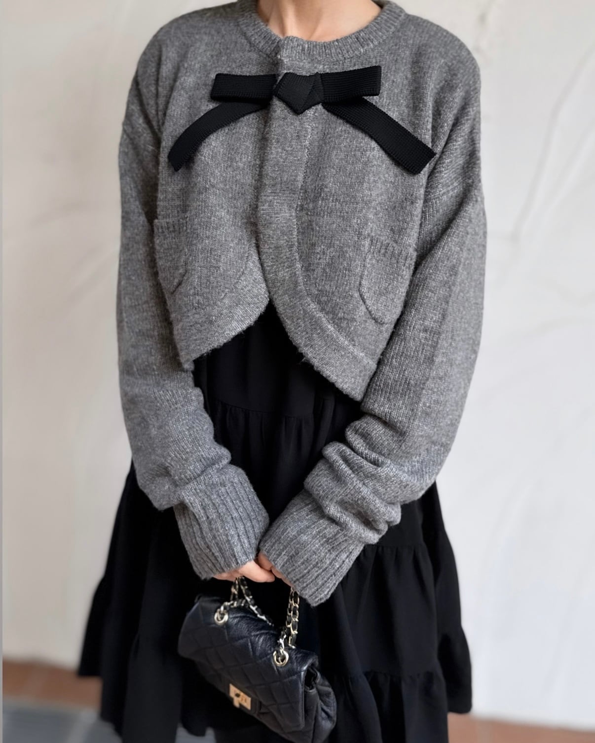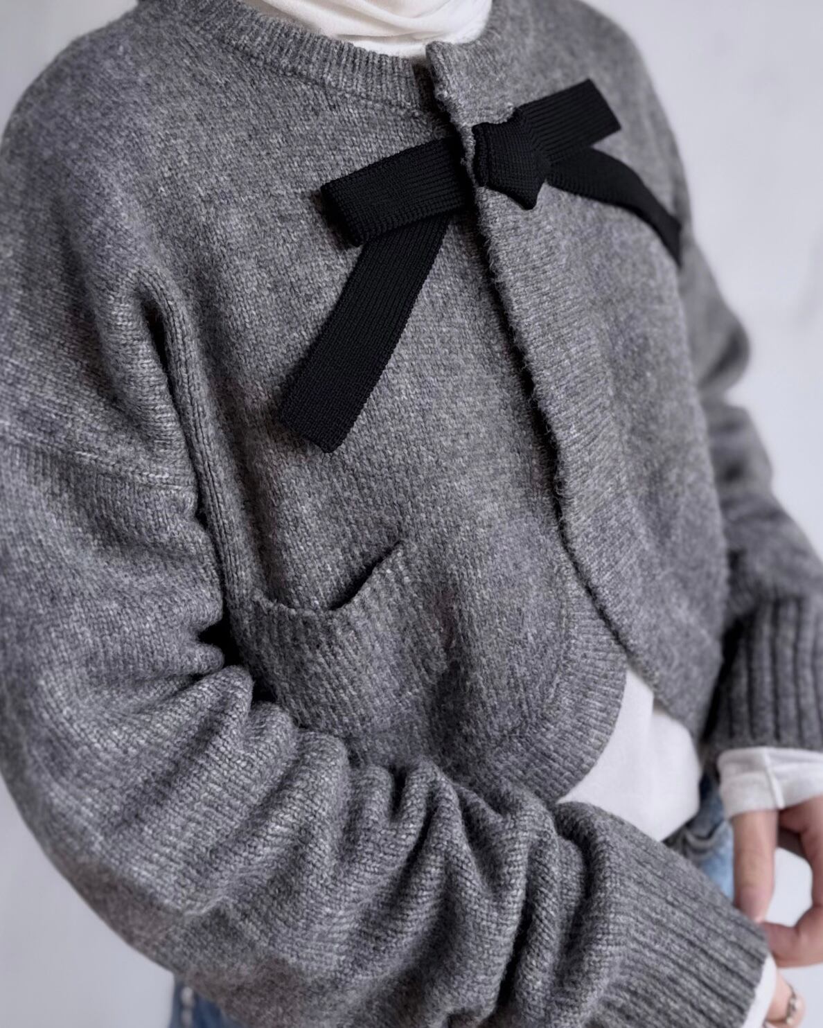 ふんわりと毛足のあるニットに首元のリボンがクラシカルな印象を添えるボレロ風カーディガン。