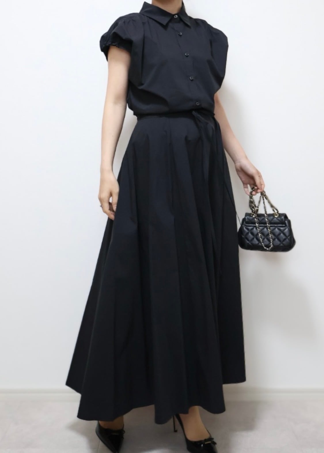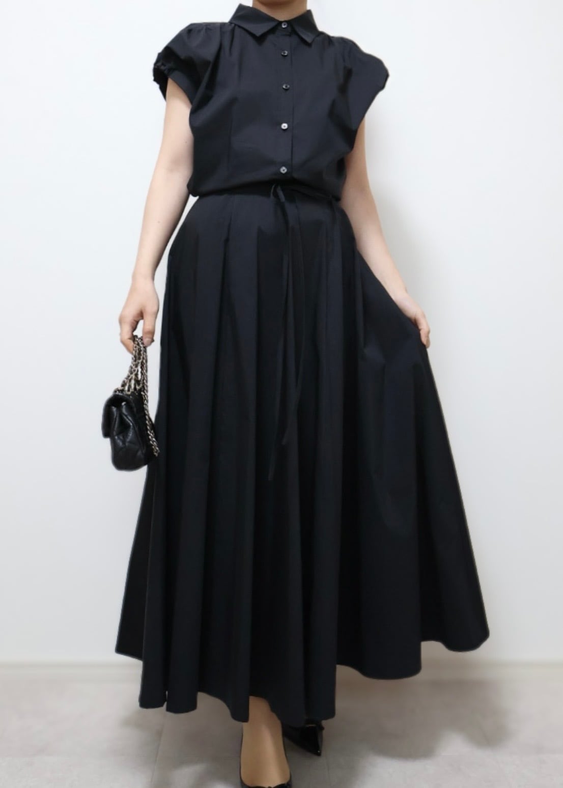 きちんと感のある襟付きデザインに女性らしいフレアーシルエットを組み合わせたワンピース。