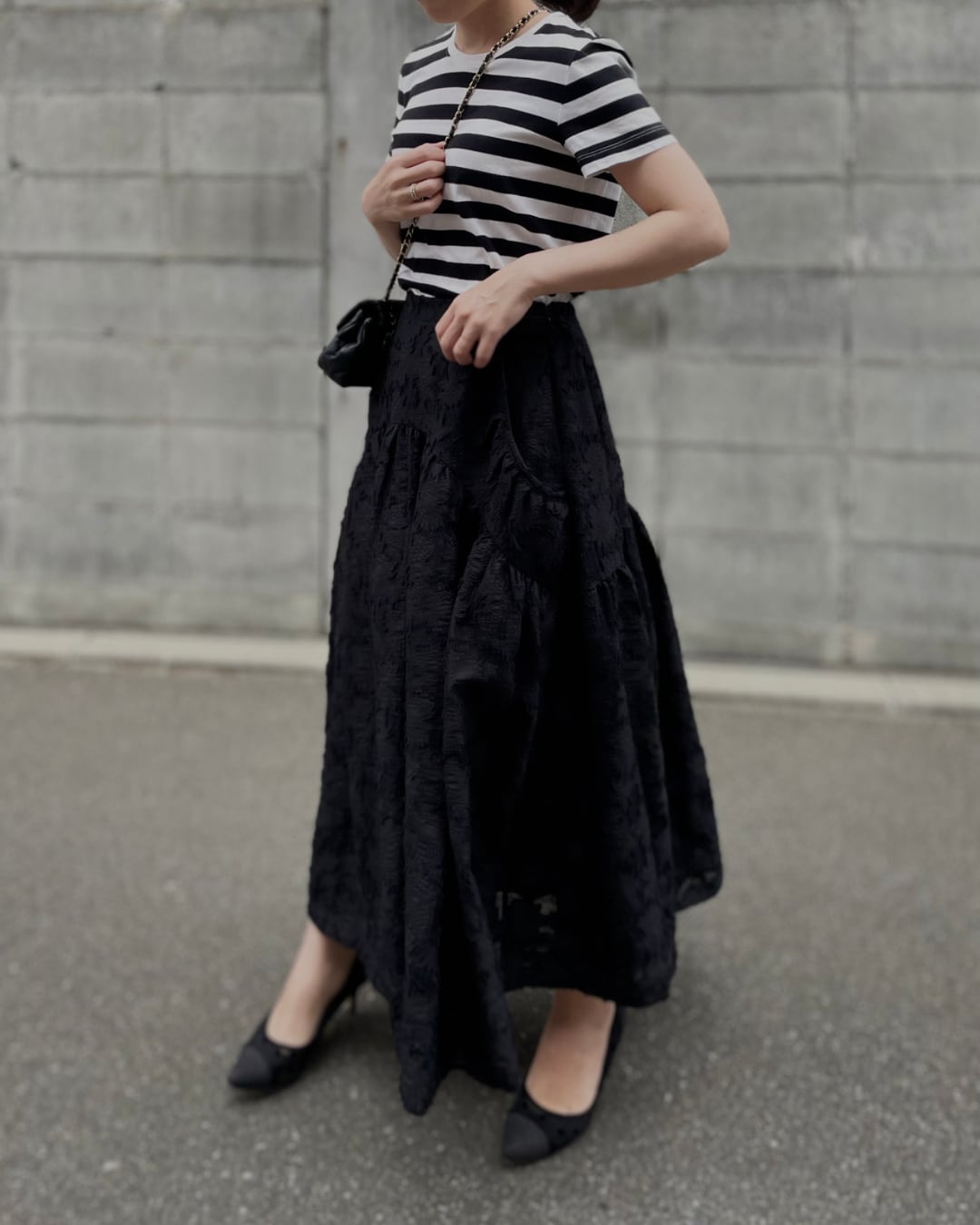 ミモレ丈で上品に見えるので、オフィスやフォーマルな場面でのおしゃれにも活躍します。